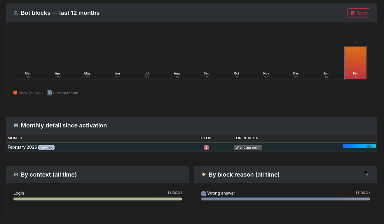 - Monthly bot-block statistics since plugin activation