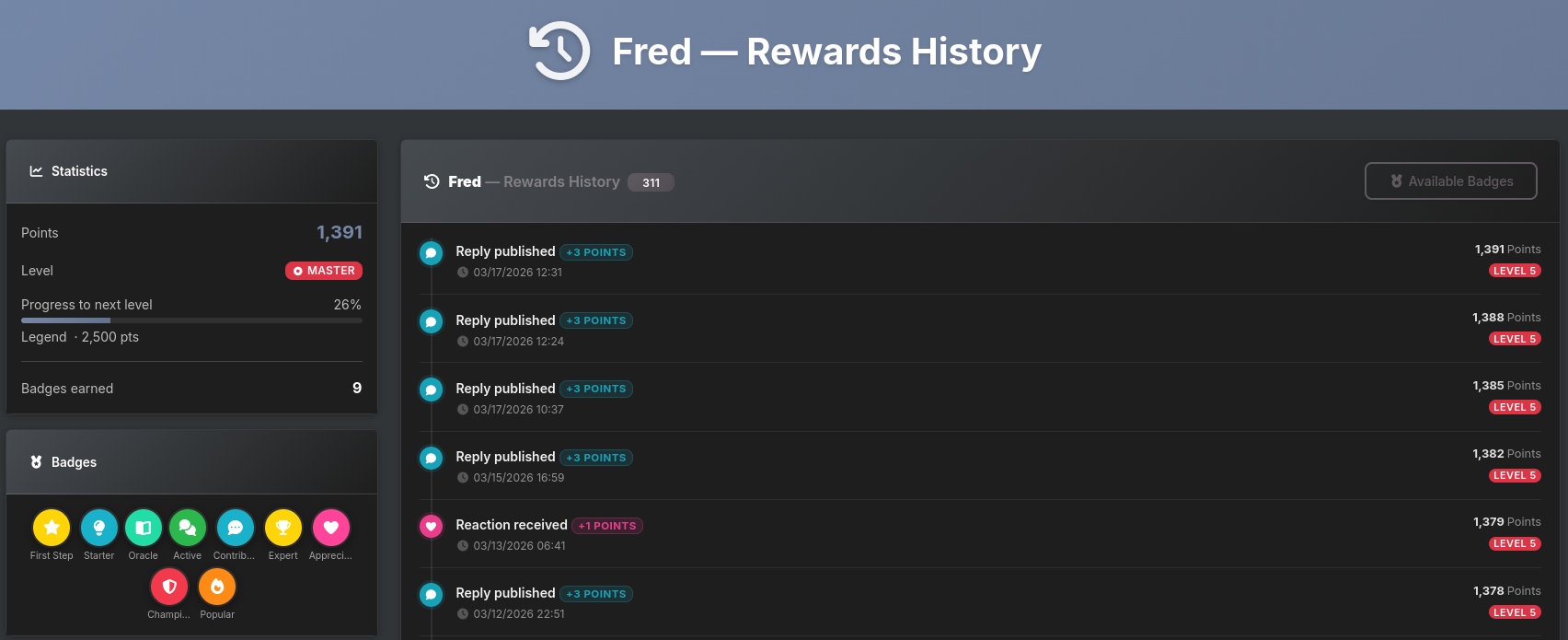 - Reputation profile tab — A dedicated tab on every user profile shows points, current level with progress bar, earned badges, and the last 20 history entries. Opening the tab directly via