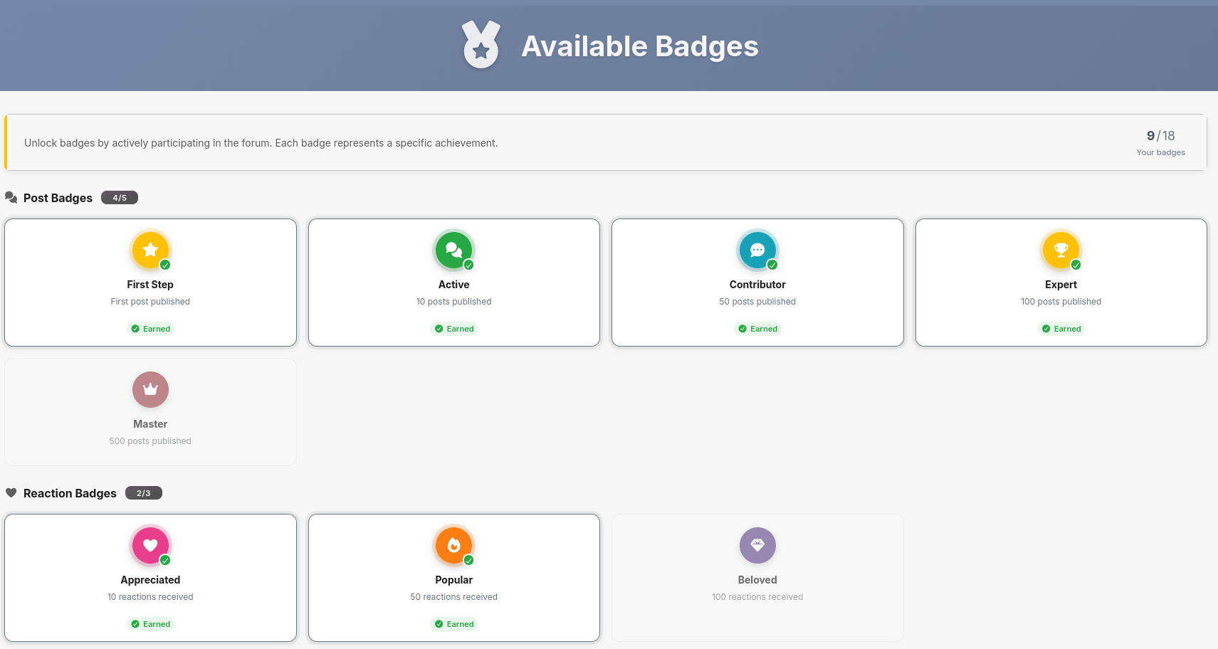 - 19 badges / achievements — Automatically awarded at milestones across five categories: posts, reactions, best answers, level achievements, and special actions.