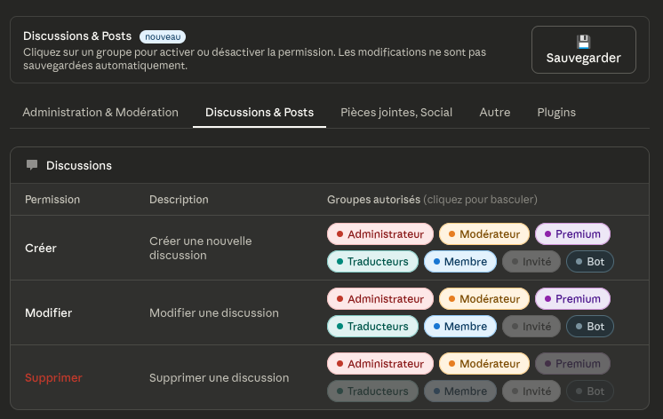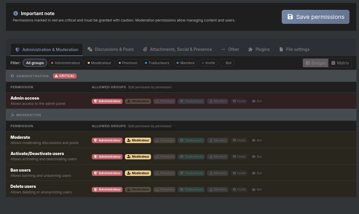 For example, clicking Moderator in the filters would isolate that column and show all its permissions across the current tab.