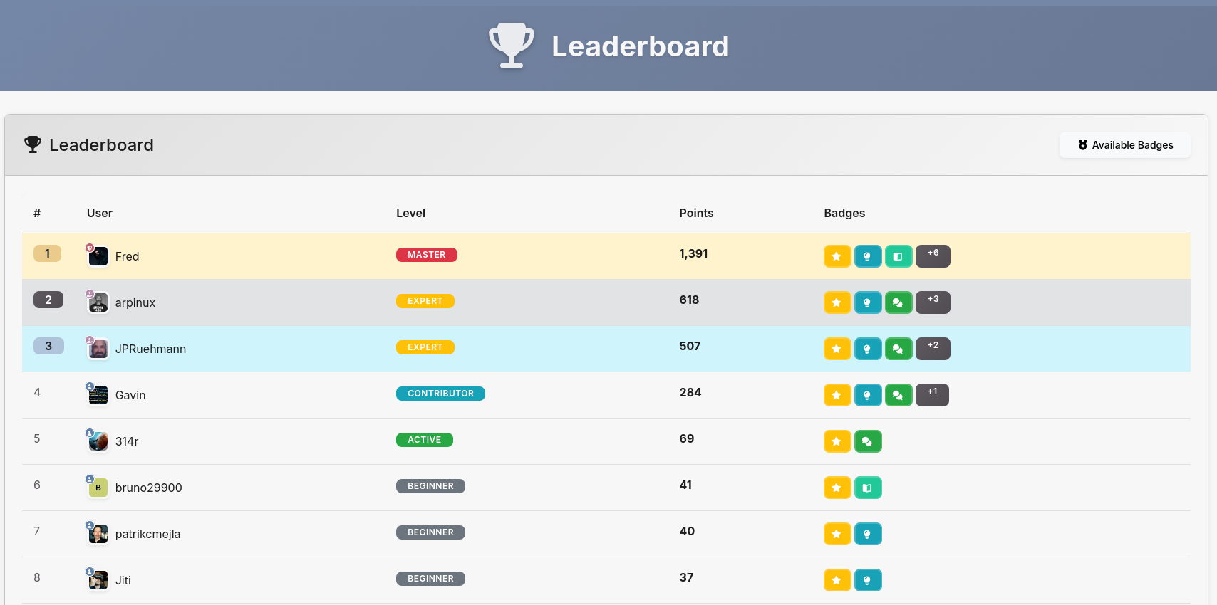 - 19 badges / achievements — Automatically awarded at milestones across five categories: posts, reactions, best answers, level achievements, and special actions.