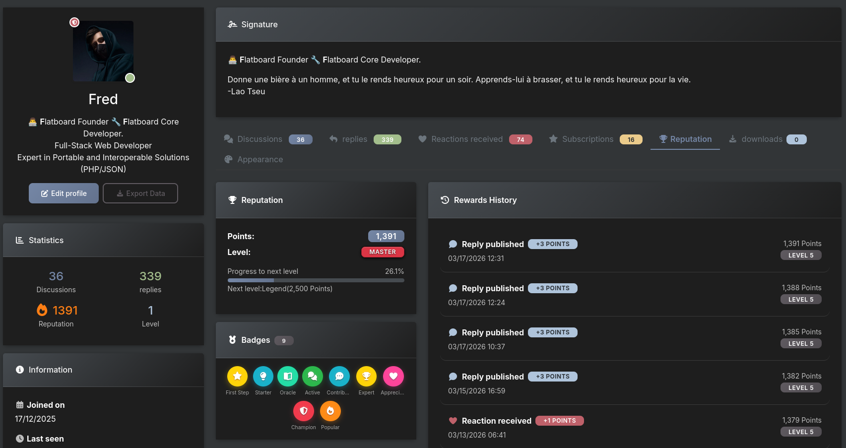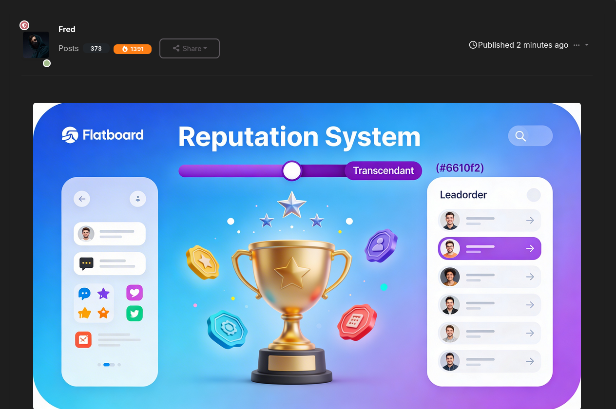 A community reputation system for Flatboard. Members earn points for their contributions, unlock levels and badges, and see their score directly on posts and user profiles.