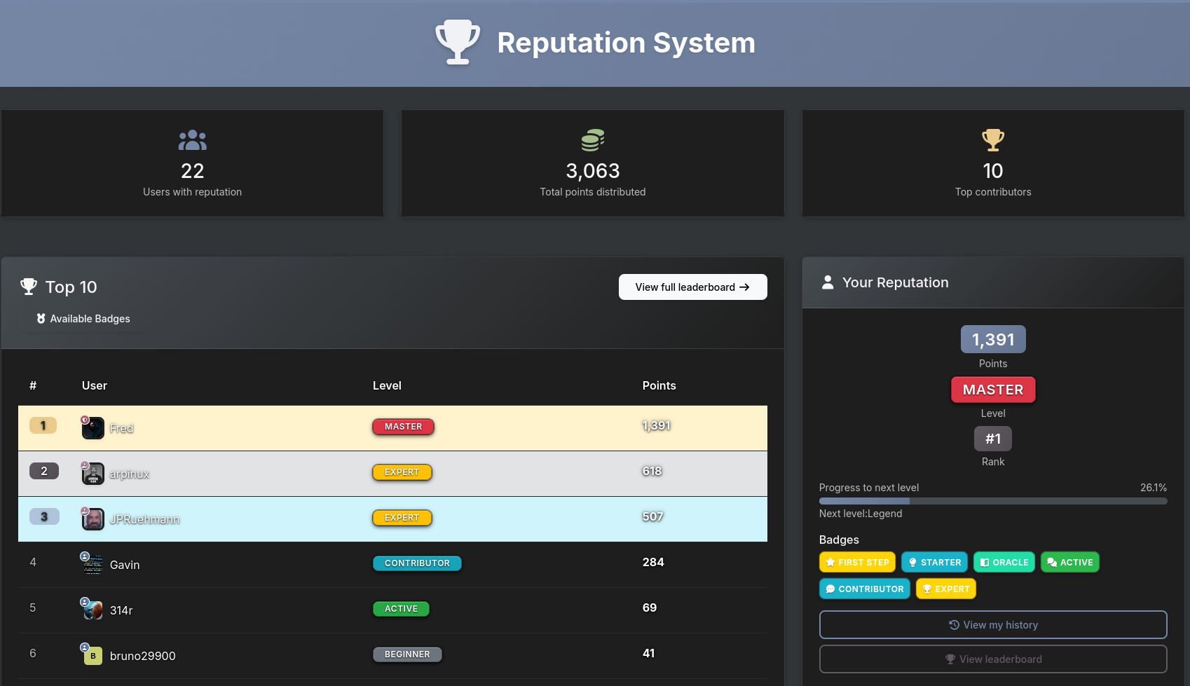 /reputation/leaderboard ranks members by total points with configurable limit and pagination. - Admin panel — Configure point values per event, enable/disable badges, levels and leaderboard, and set leaderboard limits from Admin → Plugins → Reputation → Settings.