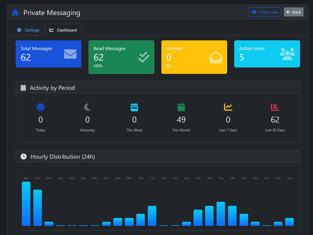 Access the admin dashboard via Admin > Plugins > Private Messaging