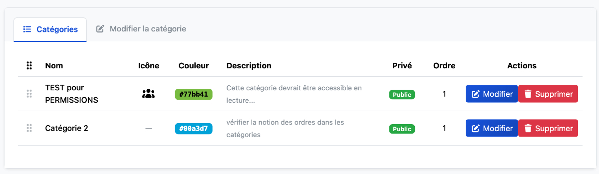 Suggestion: donner aux administrateurs le pouvoir de modifier l'ordre des catégories par glisser-déposer, et automatiquement les ordres se mettraient à jour dans la colonne qui leur revient.