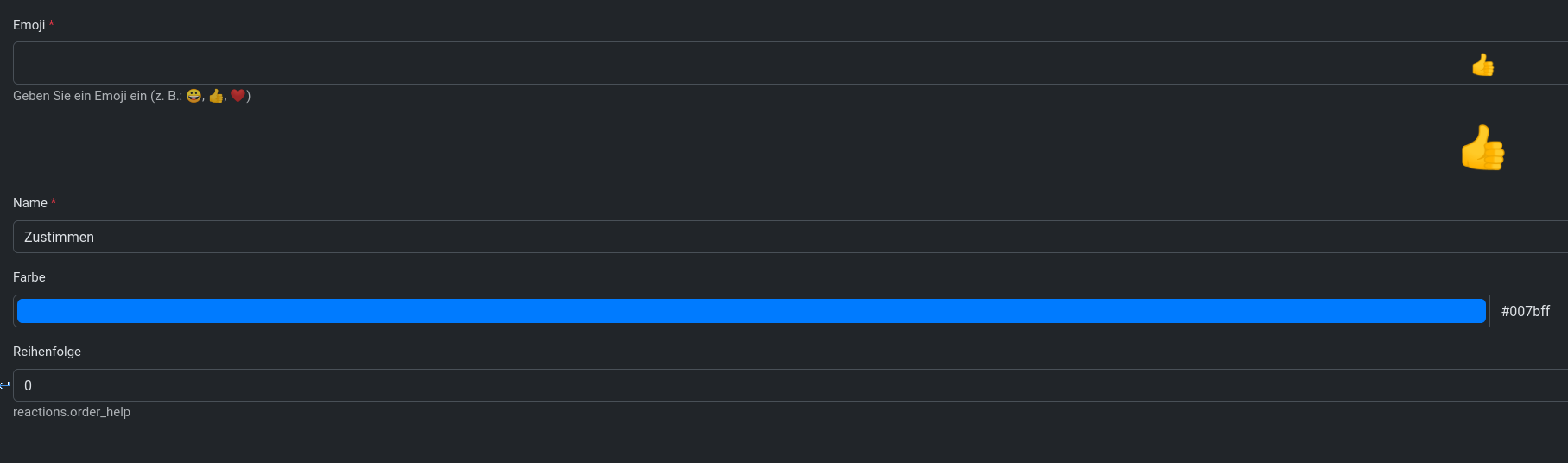 - Under The Order Field is an Variable appearing (reaction.order_help) that can´t be translated because it is not in the Language File. add it under the Help for the Emoji is not working.
