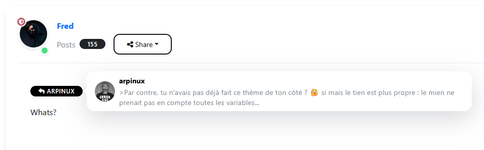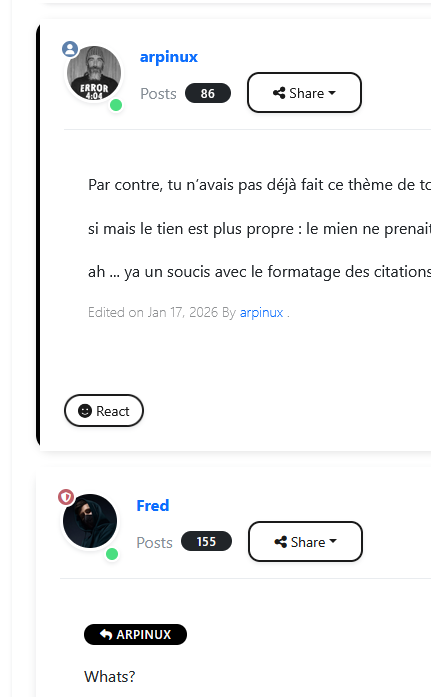 - bug du thème : nouveau bug > le thème perso n'est plus totalement pris en compte. les couleurs sont bonnes pour le header, le titre de la catégorie mais le corps du forum est aux couleurs du thème par défaut, quelles que soient les modifications effectuées dans la section thème de la page d'admin.