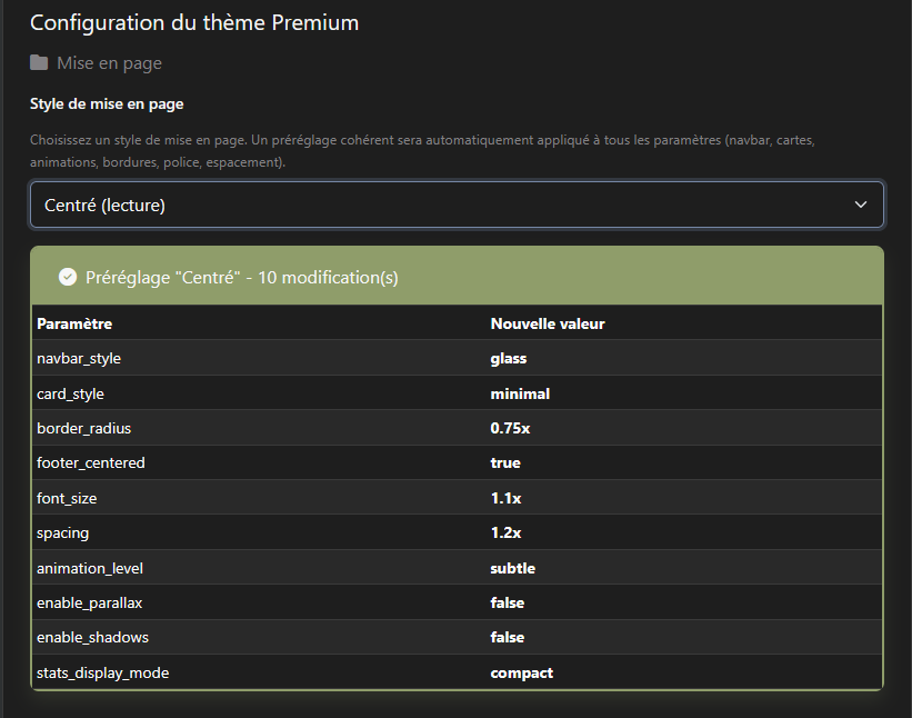 | Layout Style | Default, Centered, Wide, Compact | Default | Main layout preset (applies coordinated settings) |